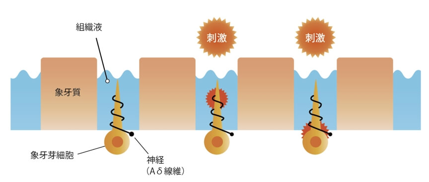 歯根が露出すると、冷たいものや熱いもの、甘いものなどが歯にしみるようになります。歯磨きの際にピリッと痛みを感じることもあります。これが知覚過敏の症状です。日常の食事や飲み物がつらくなり、生活の質に影響することもあります。