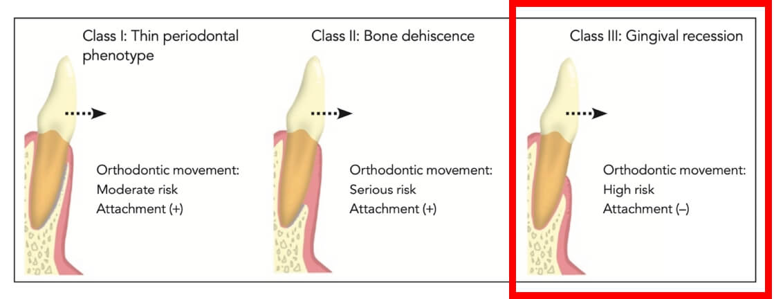 矯正治療による歯肉退縮特に非抜歯矯正(歯を抜かずに歯を並べる治療)では、歯を元の歯列外側へ移動させることによって歯根は薄い骨から押し出され、歯肉退縮の進行するリスクが生じます。